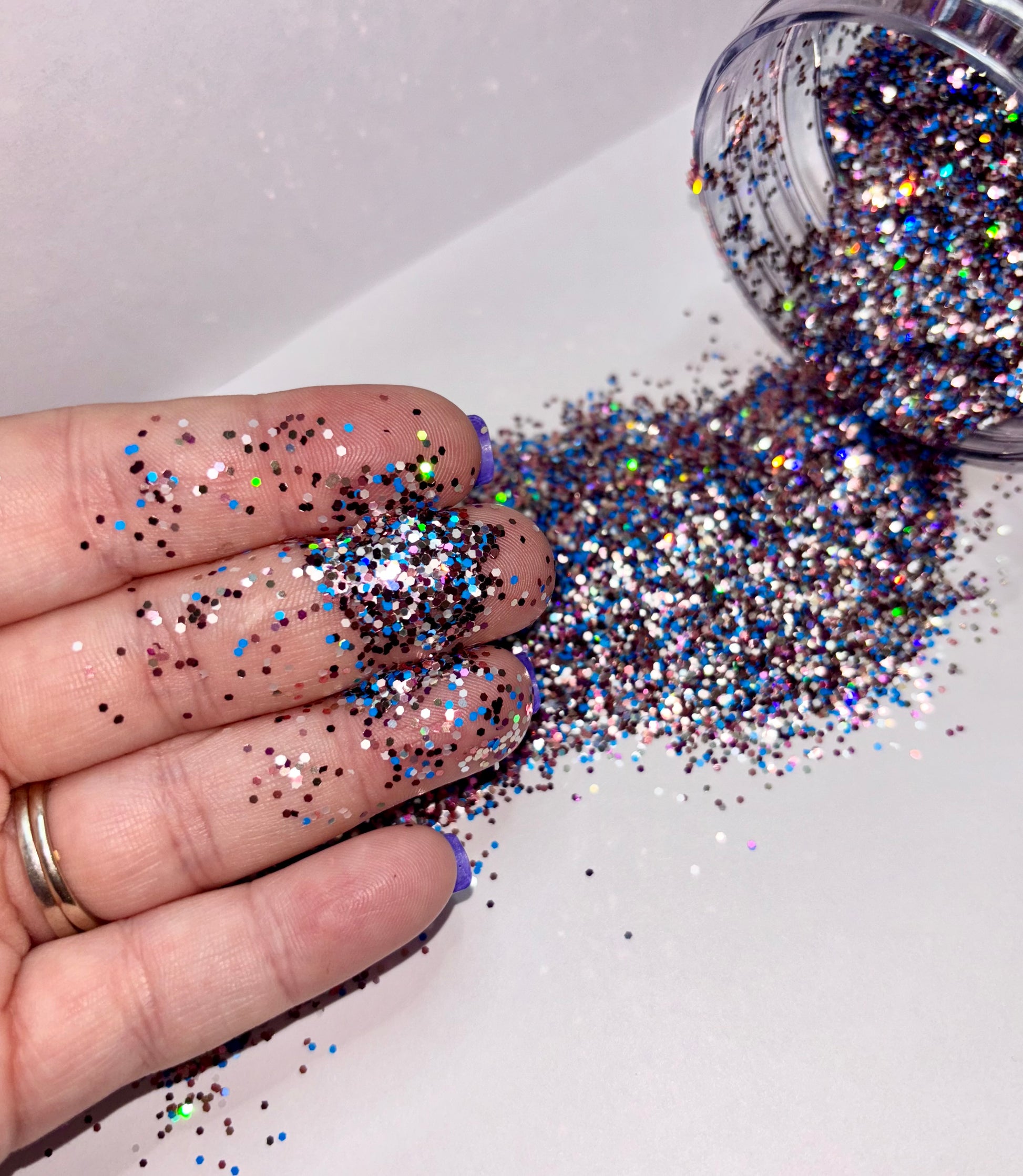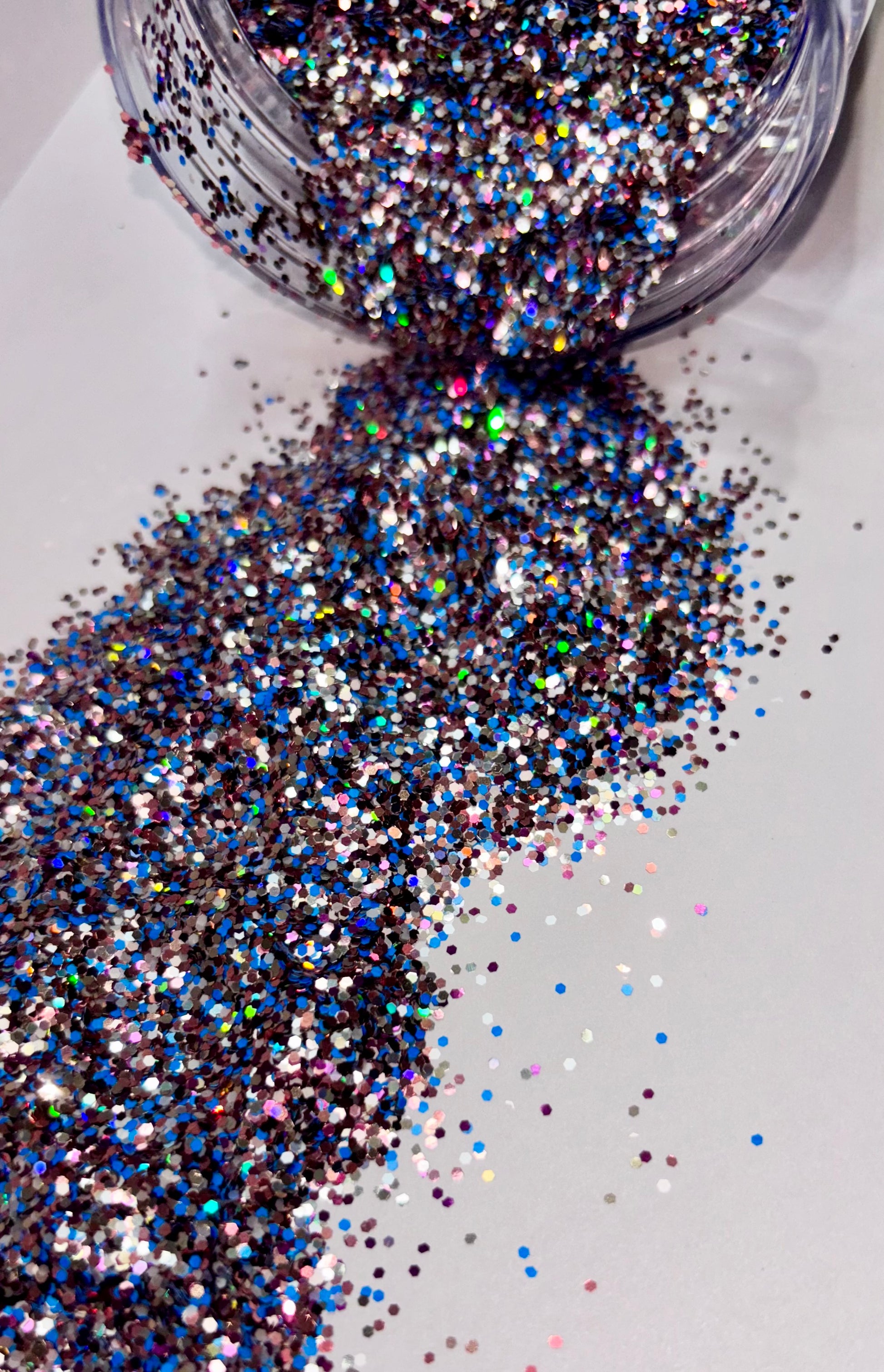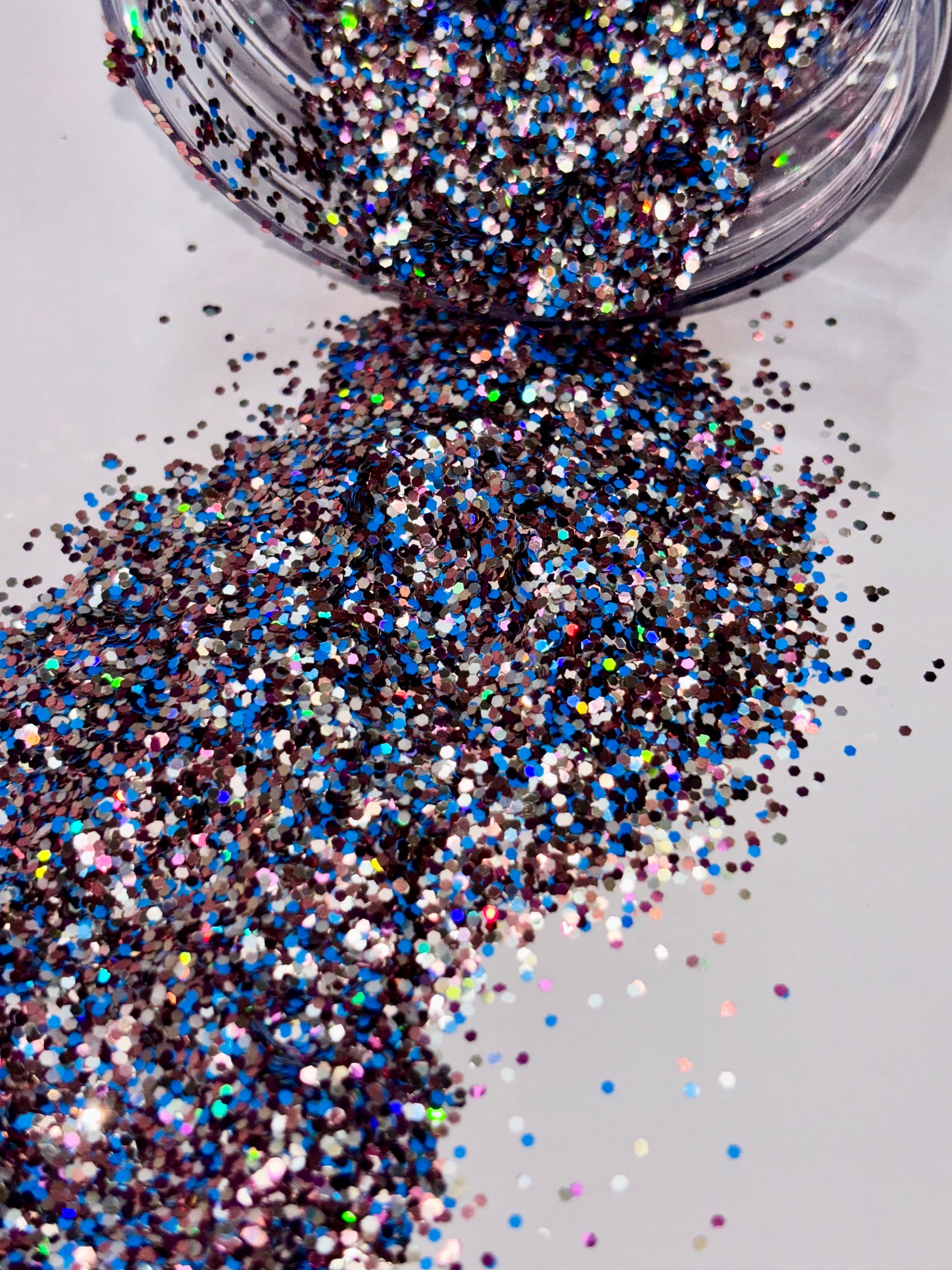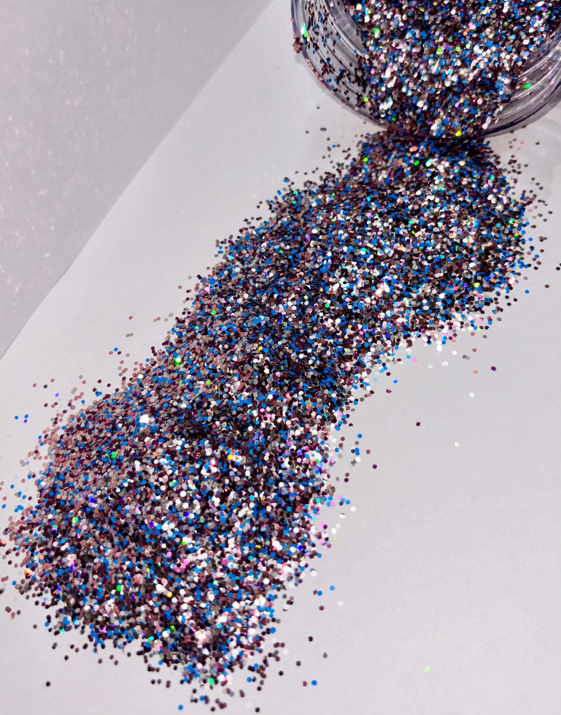 Mini Chunky mix with Cabernet, silver, rose gold and blue tones. Glitters have a mixture of metallic and holographic tones.