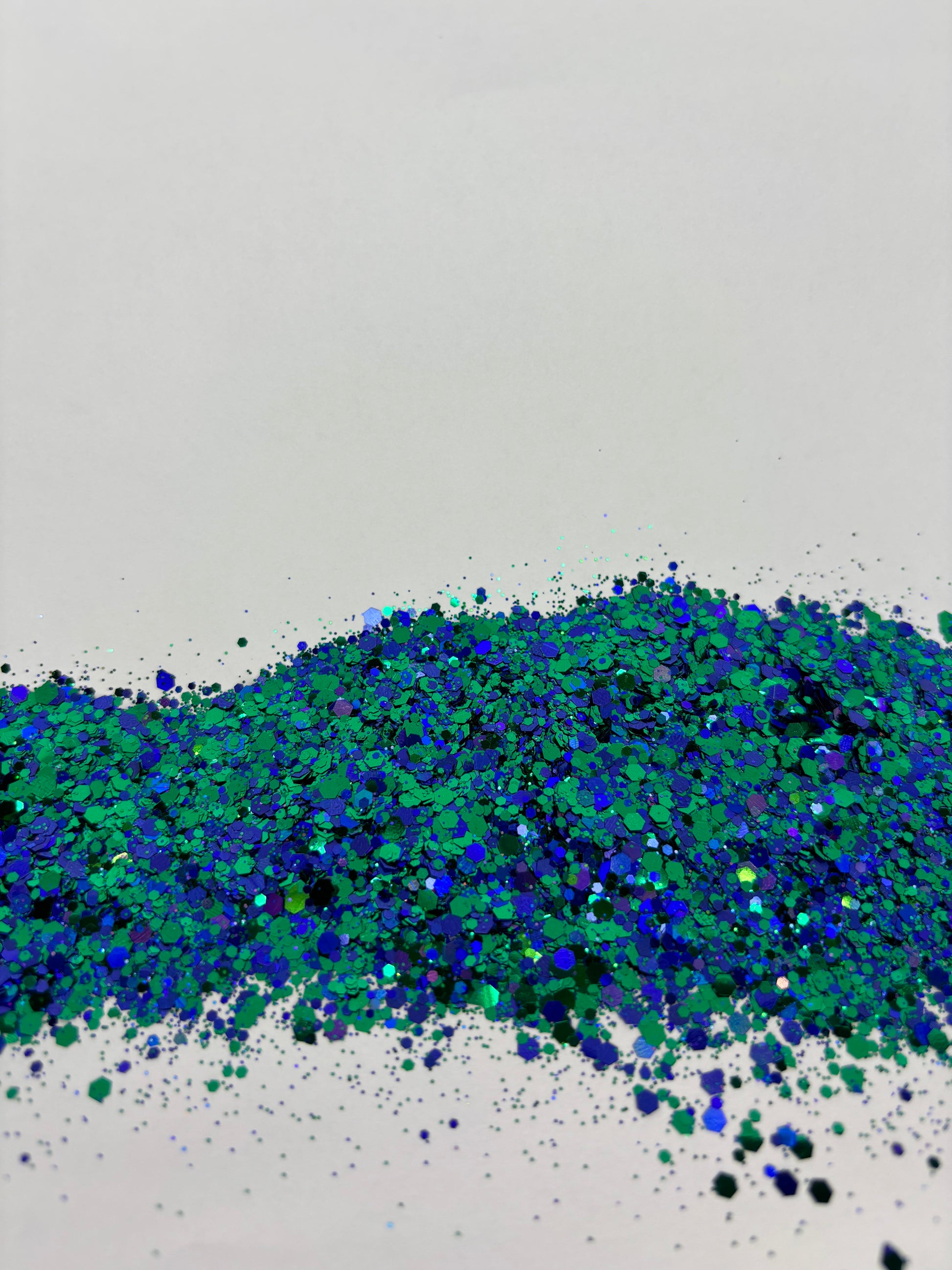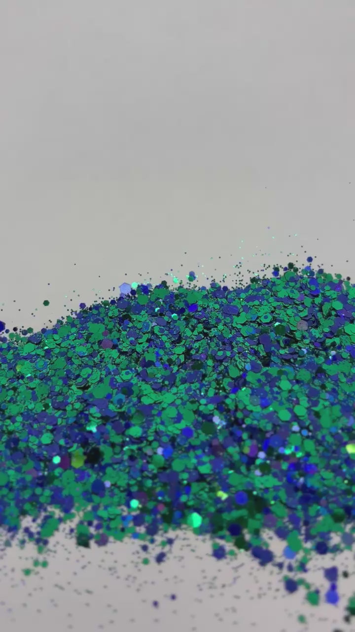 Chunky blue shift to green glitter.
